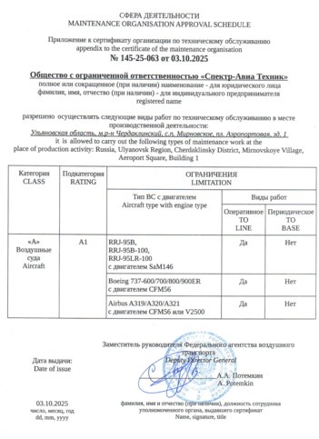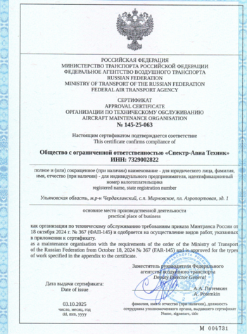 В октябре 2025 года «Спектр-Авиа Техник» успешно прошло проверку Росавиации и получило новый сертификат организации по ТО - ФАП-145.